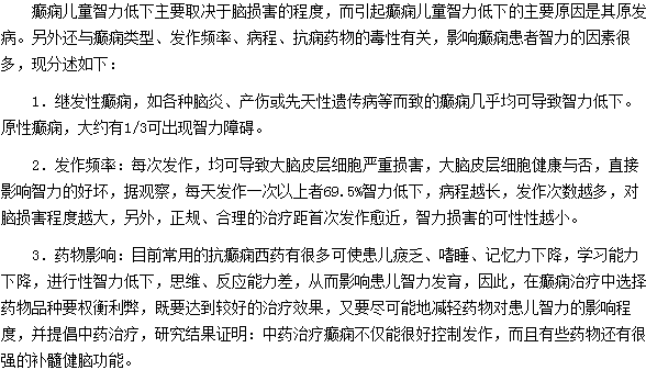 以上影响癫痫患者智力低下的因素的内容就为大家介绍完了,相信大家也已经有了基本的认识,影响癫痫患者智力低下的因素有很多,当被诊断为癫痫时应及早服用既能有效控制癫痫发作,又可促进患儿智力发育的抗痫药物,使癫痫发作豚药物毒性对患儿智力的影响降低到最低限度。