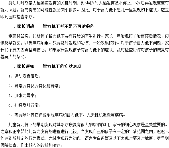 对于儿童智力低下问题,很多家长都有逃避的心理,这是非常错误的,研究证明,很多智力低下患儿在早期经过及时诊断治疗后智力可以恢复正常,所以家长要正视孩子智力低下问题,及时检查,及时治疗。