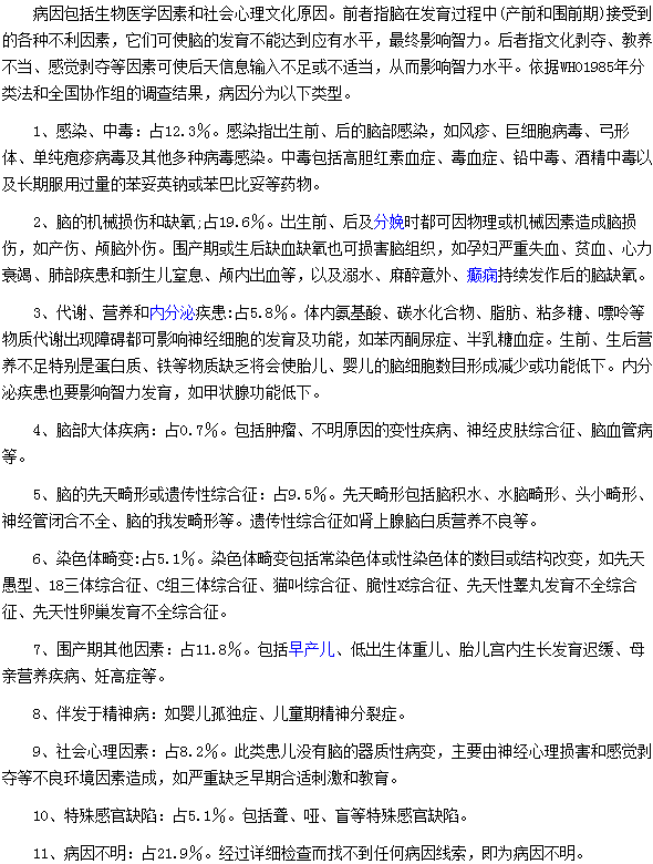 以上就是“智力低下的病因分为几种类型”的内容,希望宝妈妈们认真阅读,网站特别声明:本网站所发布的文章并不意味着赞同或证实其观点,仅作为参考信息使用。疾病诊疗或药品选用等专业问题请及时到医院就诊或咨询相关医生。