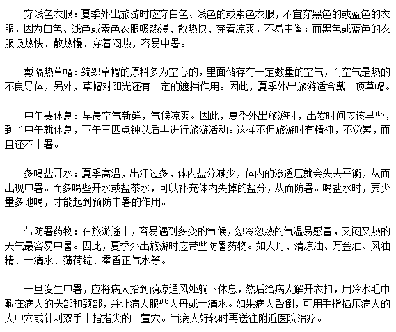 夏季气温高,排汗多,外出旅游最易发生中暑。那么,在夏季外出旅游时应怎样预防中暑呢? 下面请大家仔细阅读医学教育网编辑专门为您整理的夏季旅游预防中暑这篇文章吧。