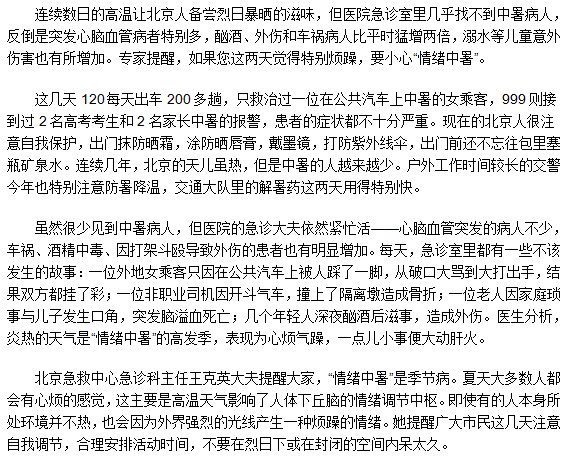 相信很多人都想知道炎热天气令人心烦高温烈日提防情绪中暑,医学教育网编辑为您搜集整理了炎热天气令人心烦高温烈日提防情绪中暑,供您参考。