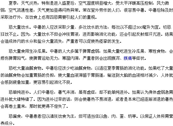 通过上述文章的阅读,相信大家对中暑后在饮食上的禁忌已经有所了解了,盛夏季节天气闷热,一定要做好防暑工作,一旦中暑除及时治疗外,在饮食上也要多加注意。