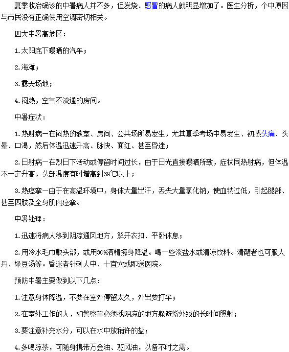 相信通过上述文章的阅读,大家对中暑的相关知识已经有所了解,中暑是夏季常见的症状,大家不用太过担心紧张,平时要多了解一些中暑的急救知识。还可以多吃一些有降暑作用的瓜果类食物,多喝一些汤水和茶。不过,要记住的是,夏季不要用凉水洗澡,不但不会解暑,还会引起感冒。