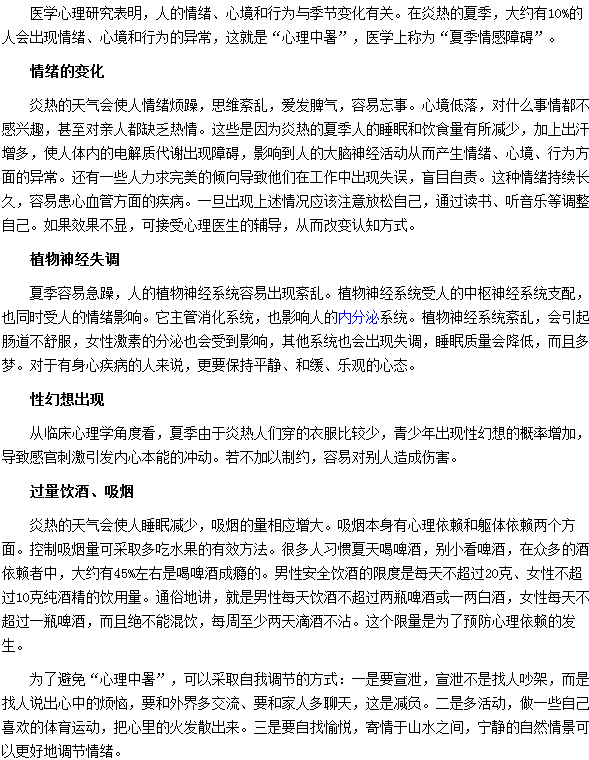 相信很多人会对人的情绪变化会导致出现心理中暑的情况的内容比较感兴趣,为此,医学教育网编辑特地为您准备了这篇关于人的情绪变化会导致出现心理中暑的情况的文章,希望对您有帮助。