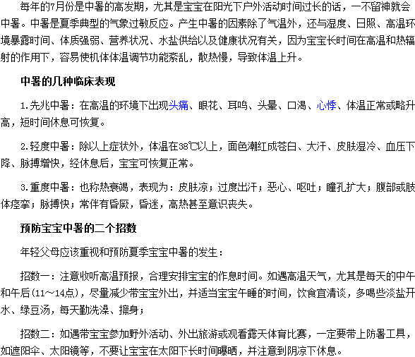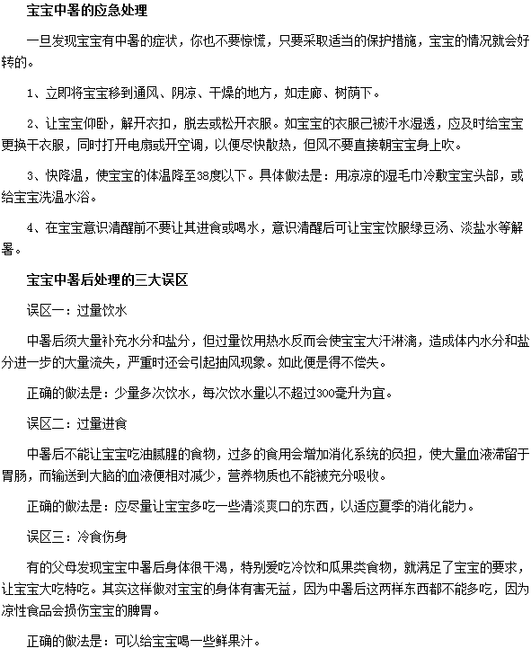 相信通过小编对宝宝中暑的应急处理措施及处理的误区的介绍,家长朋友们应该都了解了,如果宝宝出现了中暑的现象,大家不妨试试小编为大家介绍的方法,治疗的同时也要注意不要陷入误区,以免加重宝宝病情。