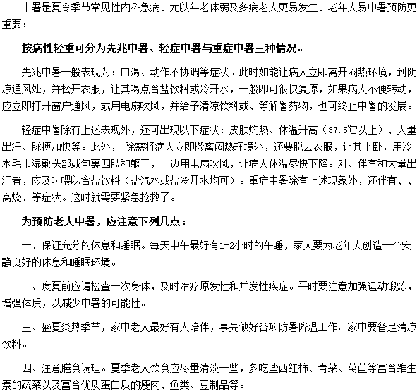 关于夏季老年人易中暑预防更重要的内容,很多人都想知道,医学教育网编辑经过多方搜寻,现将夏季老年人易中暑预防更重要的相关内容分享给大家,希望对大家有所帮助。