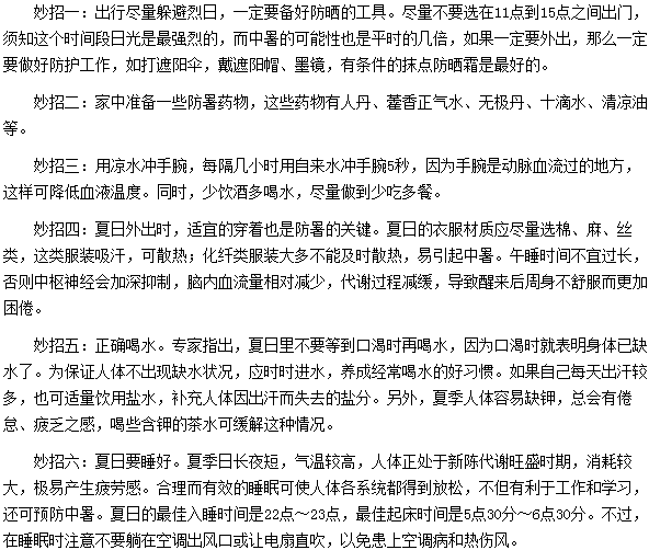 以上就是由医学教育网搜集整理关于夏天预防中暑你需要知道的六个小妙招的相关内容。相信大家对于如何预防中暑都已经知道了,希望大家在夏季要注意防暑解暑,避免繁盛中暑现象!