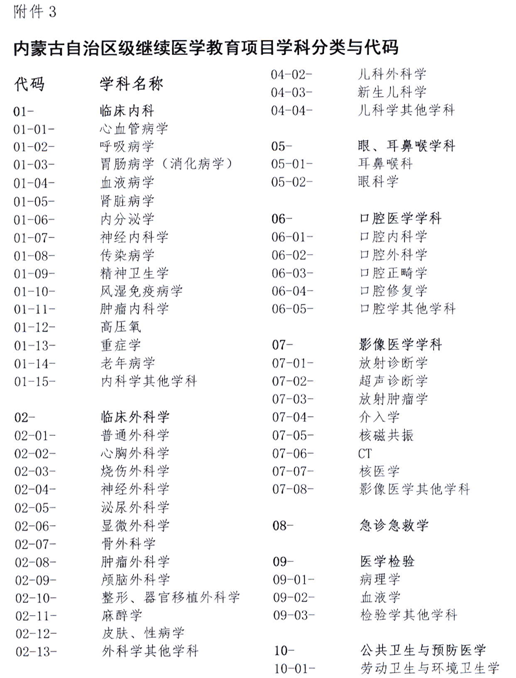 3.内蒙古自治区级继续医学教育项目学科分类与代码