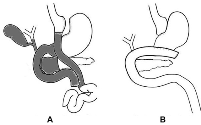 图 1 A:Roux-en-Y 解剖示意图;B:再次手术的解剖示意图