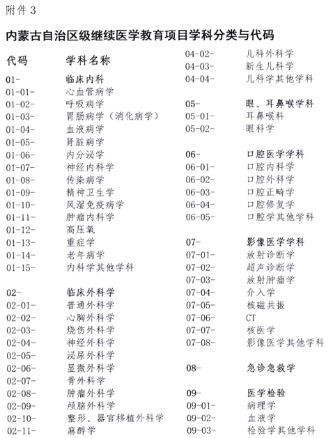 3.内蒙古自治区级继续医学教育项目学科分类与代码