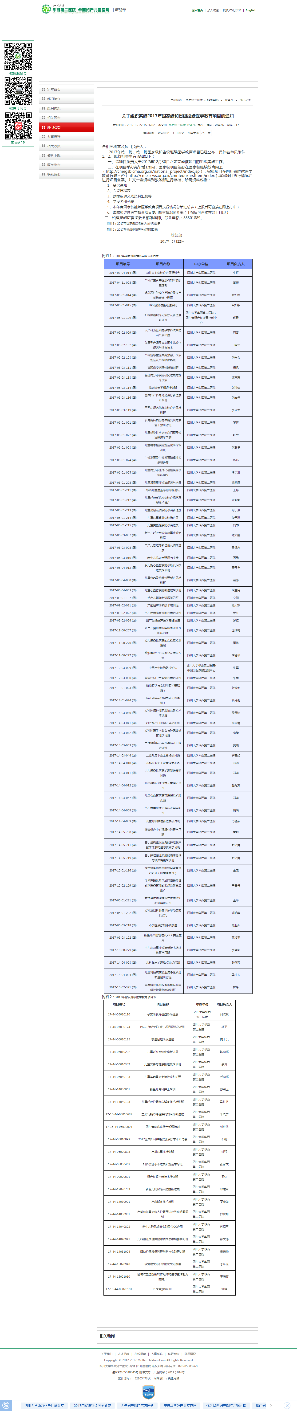 四川大学华西第二医院组织实施2017年国家级和省级继续医学教育项目,具体内容如下: