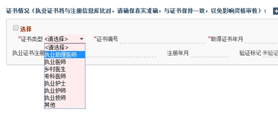 4、助理升执业的考生,必须在下图中选择“执业助理医师”,证书编号即医师资格证书编号,所有信息准确填写后,勾选左上角的“选择”。