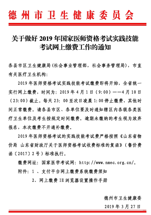 2019 年医师资格考试实践技能考试缴费即将开始,全省统一实行网上缴费,时间为:2019 年 4 月 1 日(9:00)——4 月 10 日(23:00)截止。每天 23:00 至次日凌晨 1:00 停止缴费,其他时间正常缴费。请各县市区、各单位要及时通知辖区内各级各类医疗卫生单位及考生按规定时间缴费。逾期未缴纳的考生视为放弃报名,本次缴费不开通补缴费。