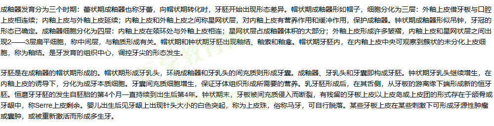 医学|教育网胚胎第5周,牙槽突表面上皮增生形成一马蹄形的原发性上皮带,此带继续向深层生长,并分裂为向颊(唇)方向生长的前庭板和舌(腭)侧生长的牙板。牙板的发生是牙齿发育的开始,牙胚由牙板及邻近的外胚间叶组织发育而来。牙胚由成釉器、牙乳头和牙囊构成。医学|教育网牙胚将形成4种牙体组织和部分牙周组织,其中成釉器形成釉质,牙乳头形成牙本质和牙髓,牙囊形成牙骨质、牙周膜和部分牙槽骨。