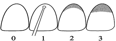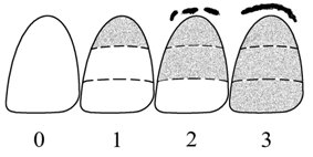 3=牙颈部菌斑覆盖面积超过1mm,不足牙面1/3