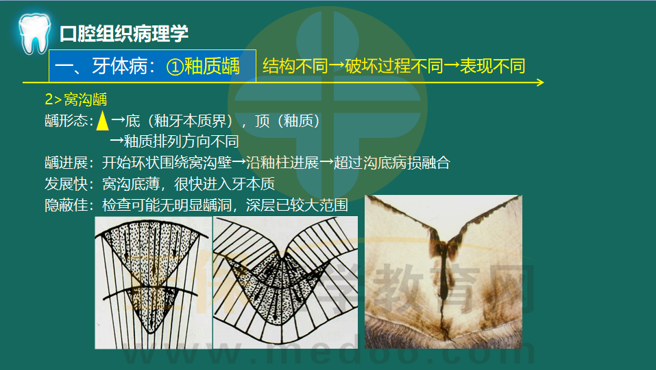 咬合面点隙窝沟是食物、菌斑滞留区,且不易清洁,故窝沟是龋病最好发的部位,形成窝沟龋。窝沟龋的病变过程、组织学特征与平滑面龋相似,但由于窝沟龋的解剖特点、釉柱排列方向与平滑面牙釉质不同,形成窝沟龋的形态与平滑面龋不同。该知识点可与平滑面龋对比记忆,同样需要大家牢牢掌握。