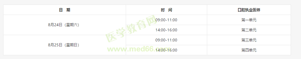 注:2019年军队考生加试口腔执业医师考试军事医学内容的考试时间为8月23日17:00-18:00。