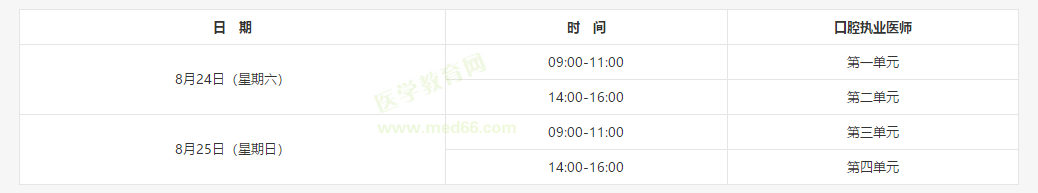 注:2019年军队考生加试口腔执业医师考试军事医学内容的考试时间为8月23日17:00-18:00。