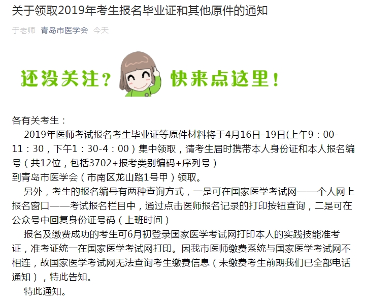 通知原文: 山东省青岛市发布关于领取2019年医师资格考试考生报名毕业证和其他原件的通知