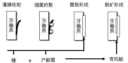 获得性膜形成和细菌初期聚集—细菌迅速生长繁殖—菌斑成熟