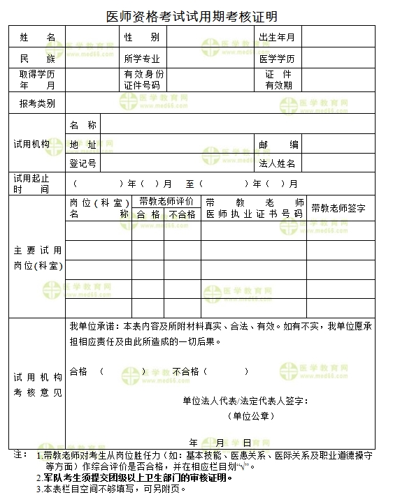 关于2019年口腔执业助理医师试用期考核证明表哪里有?相信很多考生会十分关注,小编将医师资格考试试用期证明表格为大家整理如下: