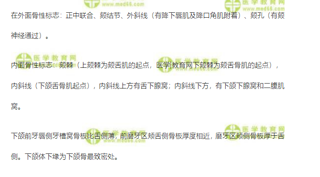以上为““下颌骨解剖特点”2019年口腔助理口腔解剖生理学考点”全部内容,希望对正在备战口腔医师考试的人提供帮助,更多备考资料干货,敬请关注医学教育网口腔执业助理医师辅导精华栏目。