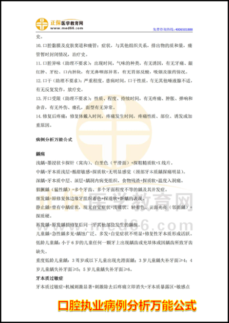 2、病例分析万能公式:口腔助理医师技能考试第五站病例分析,计算机呈现试题,考生口述作答,由考官评分,分值18分。