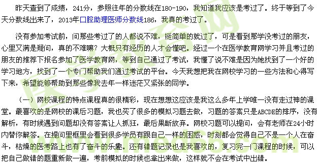 我的第一次医考,因为有了医学教育网的帮助,画了一个完美的句号。每年的医考结果都是有人欢喜有人愁,要相信这个网站有非常专业的老师给我们讲课,加上自己努力,一定会通过资格考试的,最后祝愿大家新的一年都能通过资格考试!