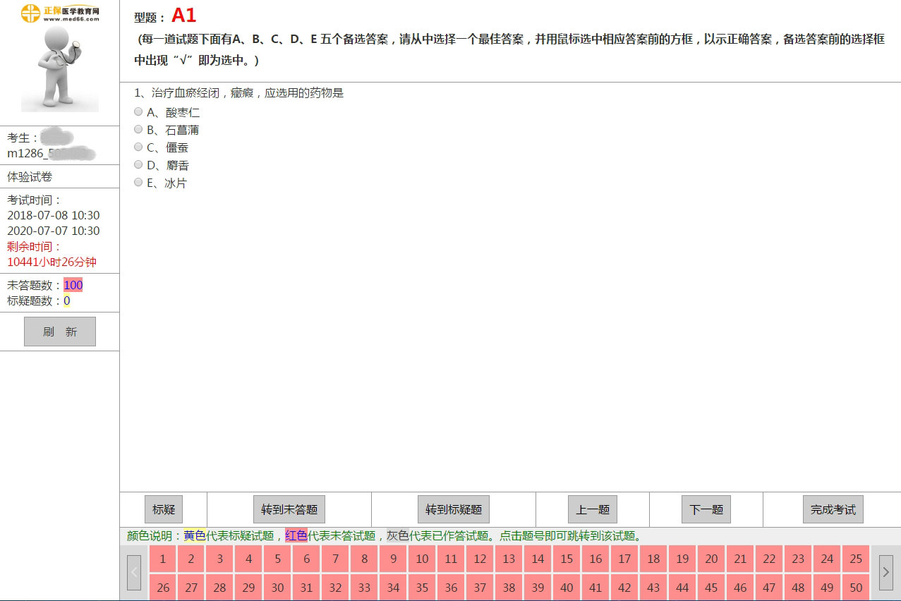 标疑:点击该按钮标疑当前试题,如果当前试题为A3/A4(中医助理没有该种题型)或者B1题型试题会将该试题的所有子试题同时标疑。