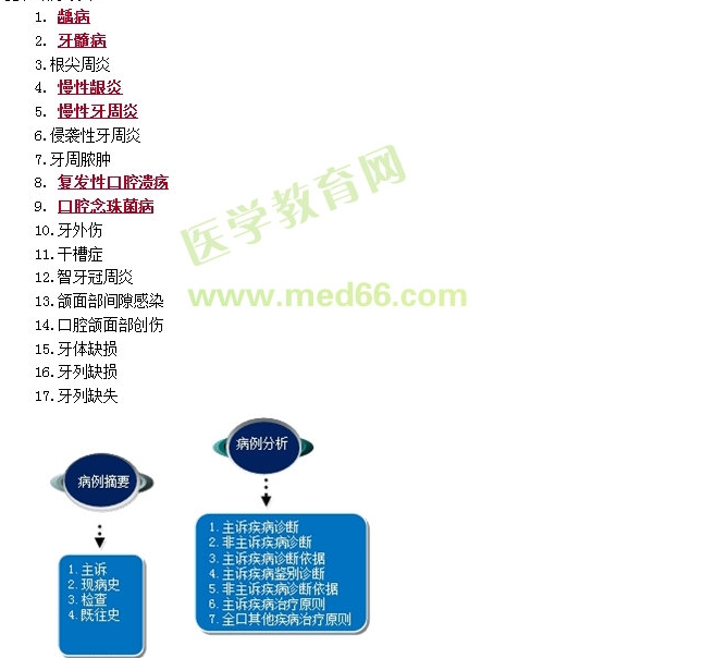 模拟口腔疾病的标准化病例,每个病例至少包括2——3种疾病。病例分析包括诊断、鉴别诊断及其依据和治疗设计。