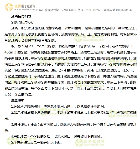 “牙线的使用指导——口腔执业助理医师实践技能考点”的内容,由医学教育网编辑整理搜集,希望对正在备战口腔医师考试的人提供帮助,更多备考资料干货,敬请关注医学教育网。
