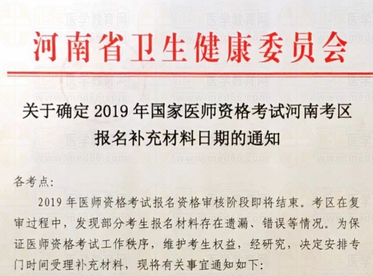 2019年医师资格考试报名资格审核阶段即将结束。考区在复审过程中,发现部分考生报名材料存在遗漏、错误等情况。为保证医师资格考试工作秩序,维护考生权益,经研究,决定安排专门时间受理补充材料,现将有关事宜通知如下: