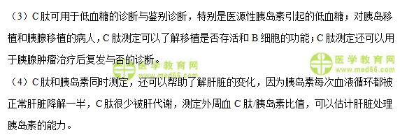 (2)C肽测定还用于指导胰岛素用药的治疗,可协助确定病人是否继续使用胰岛素还是只需口服降糖药或饮食治疗。