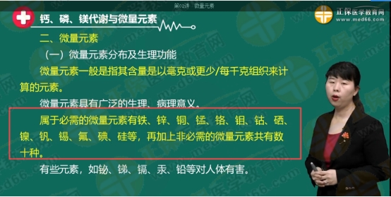 微量元素一般是指其含量是以毫克或更少/每千克组织来计算的元素。微量元素具有广泛的生理、病理意义。属于必需的微量元素有铁、锌、铜、锰、铬、钼、钴、硒、镍、钒、锡、氟、碘、硅等,再加上非必需的微量元素共有数十种。有些元素,如铋、锑、镉、汞、铅等对人体有害。