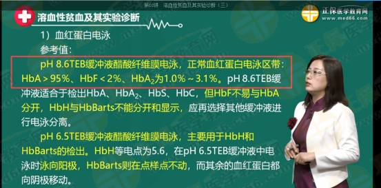 pH8.6TEB缓冲液醋酸纤维膜电泳,正常血红蛋白电泳区带:HbA>95%、HbF<2%、HbA2为1.0%~3.1%。pH8.6TEB缓冲液适合于检出HbA、HbA2、HbS、HbC,但HbF不易与HbA分开,HbH与HbBarts不能分开和显示,应再选择其他缓冲液进行电泳分离。