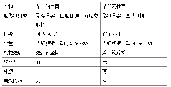 革兰阳性菌和革兰阴性菌的细胞壁结构显著不同(见下表)。革兰阳性细菌细胞壁较厚,肽聚糖含量丰富,各层肽聚糖之间通过五肽交联桥与四肽侧链交联,构成三维立体网格,使细胞壁坚韧致密。与此相比,革兰阴性菌细胞壁较薄,肽聚糖含量少,而且肽聚糖层之间由四肽侧链直接交联,形成二维结构。除染色性外,两者在抗原性、毒性、对某些药物的敏感性等方面都有很大差异。