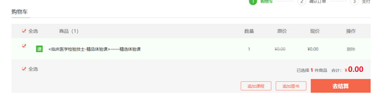 第一步:点击上文的“领取课程”进入购物车,并点击去结算;