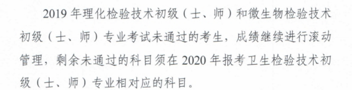 有部分考生是在2019年参加了理化检验和微生物检验专业的考试,考试成绩继续进行滚动管理,剩余未通过的科目须在2020年报考卫生检验技术初级(士、师)专业相对应的科目。
