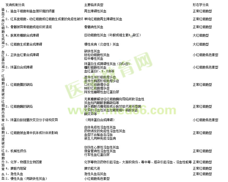 (2)减少:由于各种病因导致周围血红细胞减少,即病理性贫血。按病因可将贫血分成造血不良、红细胞过度破坏和失血三大类,其主要临床类型及形态学分类的关系将在第三节中阐述。贫血的病因学分类见表2-1