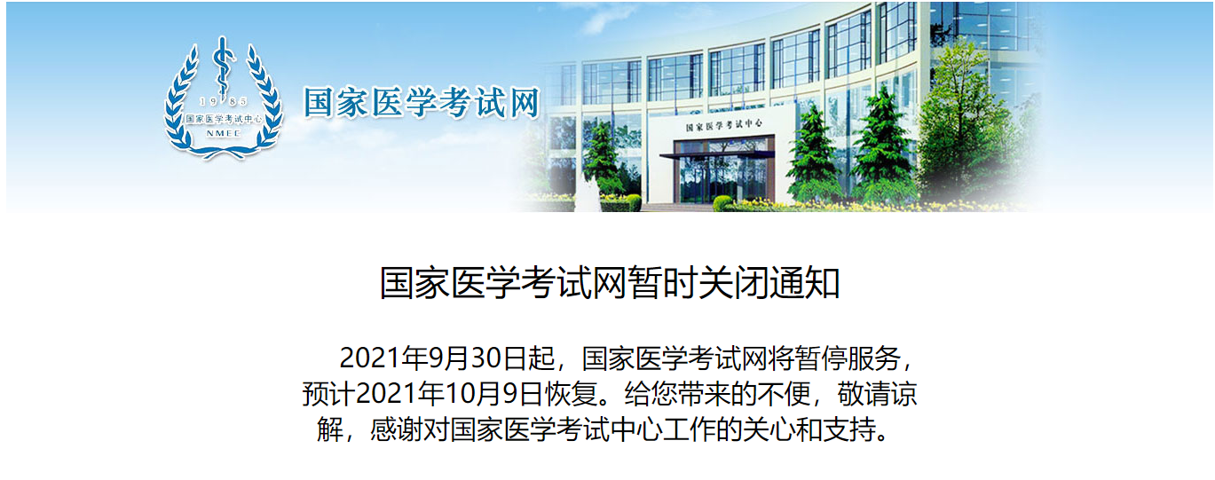 2021年9月30日起,国家医学考试网将暂停服务,预计2021年10月9日恢复。给您带来的不便,敬请谅解,感谢对国家医学考试中心工作的关心和支持。