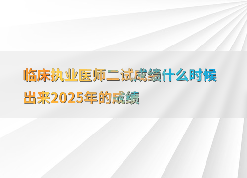 2025年临床执业医师一年两试成绩预计在12月初公布,参考近年时间:2024年为11月30日,2023年和2022年均为12月8日,2021年为12月15日。