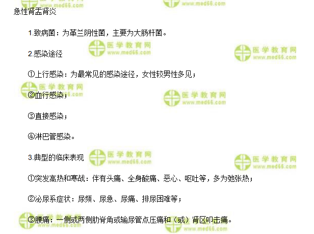 以上为:“2019年临床执业医泌尿系统-急性肾盂肾炎考点”全部内容,希望可以帮到您!更多的关于考试资料的文章随时关注医学教育网临床执业医师辅导精华栏目!