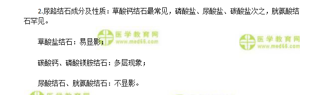 2.D【答案解析】约90%以上结石能在平片中发现,应做正侧位摄片。结石过小或钙化程度不高,相对纯的尿酸结石,可不显示医学|教育网。