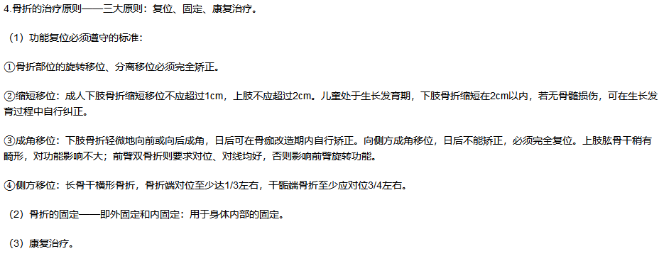 3.骨折的治疗原则是复位、固定和康复治疗。