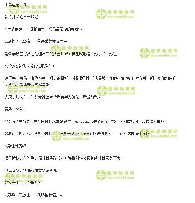 共计10个晚期并发症,需要全部记住,医学|教育网记忆要点是与骨折基本已经没有直接关系,而是一个长期性损伤或者制动导致的损害。与早期并发症一样,分点的内容更容易考核,多为A型题。