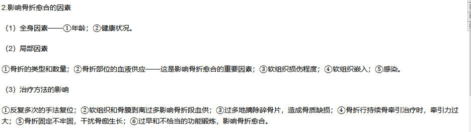 骨折的愈合可分为血肿机化演进期、原始骨痂形成期和骨痂改造塑形期。影响骨折愈合的因素有:骨折部位的血液供应,软组织损伤程度,骨折端有无软组织嵌入或感染因素,年龄、健康状况、治疗的正确与否等。医学|教育网以上内容是简略记忆,考试内容会更深入,建议大家在简版基础上拓展记忆,考核题型多为A型。