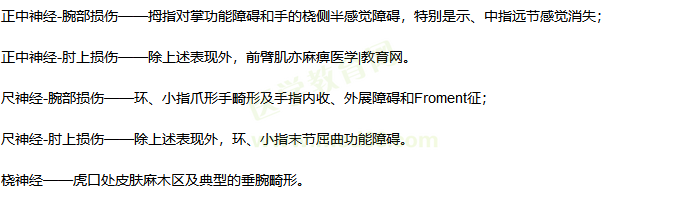 医学|教育网单独考核几率低,一般都是结合上肢骨折或者脱位进行考察,重点掌握各种神经损伤的特征性表现即可。
