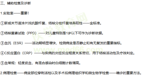 掌握骨与关节结核的实验室检查(结核分枝杆菌培养阳性——金标准)和影像学检查。MRI:有助于早期诊断;X线在起病6-8周后方有改变;CT对显示病灶周围的寒性脓肿有独特的优点。常结合临床表现与诊断、治疗综合考查医学|教育网。
