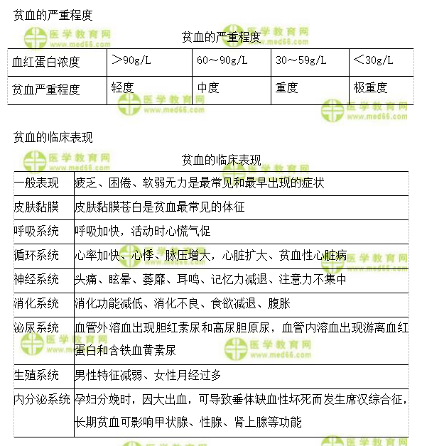 以上关于“贫血的严重程度及临床表现”的文章由医学教育网编辑整理搜集,希望可以帮助到大家,更多的文章随时关注医学教育网临床执业医师考试栏目!