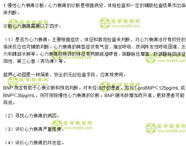 关于临床执业《心血管系统》考点:“慢性心力衰竭的诊断与鉴别诊断”相关内容,相信参加2020年临床执业医师考试的考生都在关注,为方便大家备考,在此医学教育网小编为大家整理如下内容: